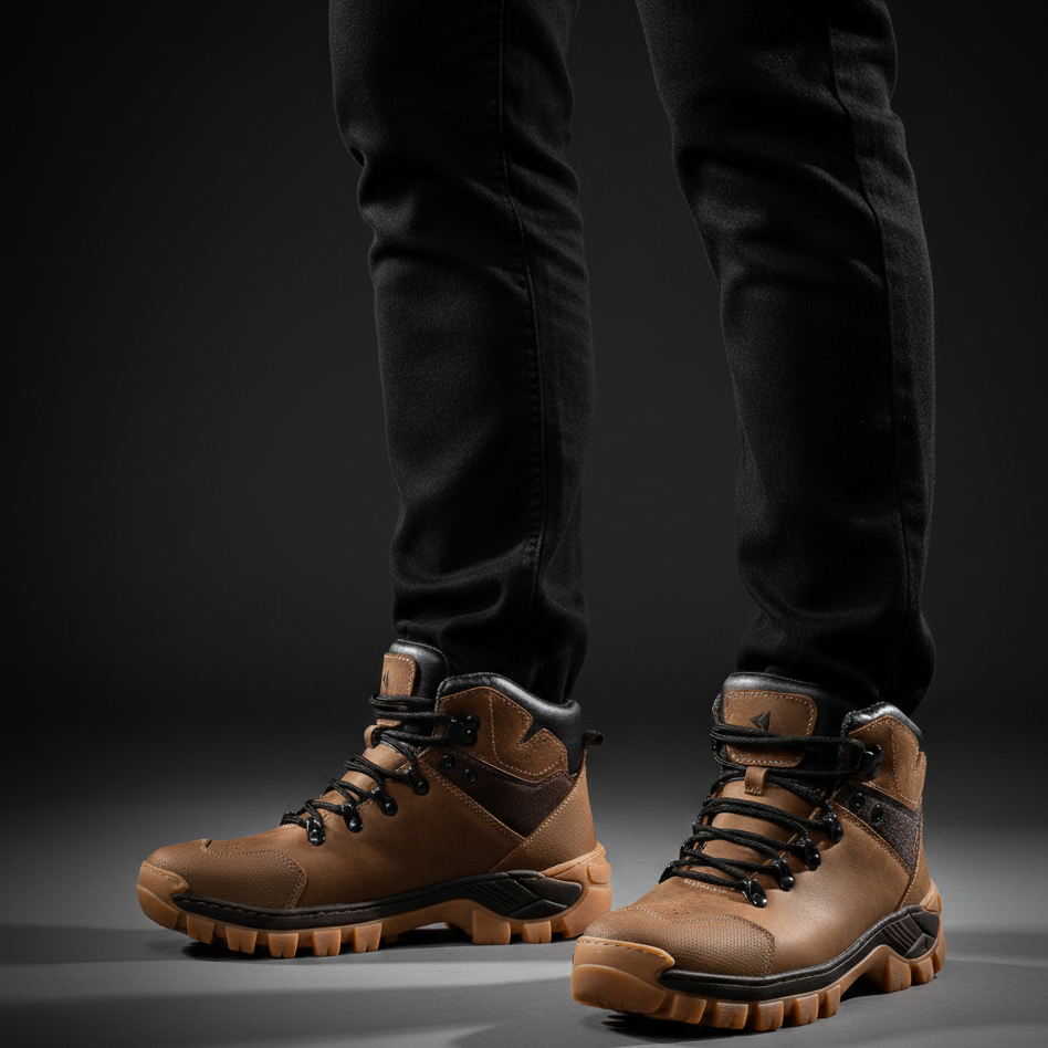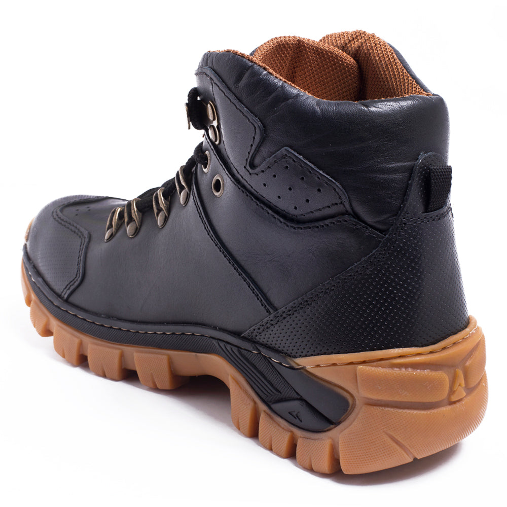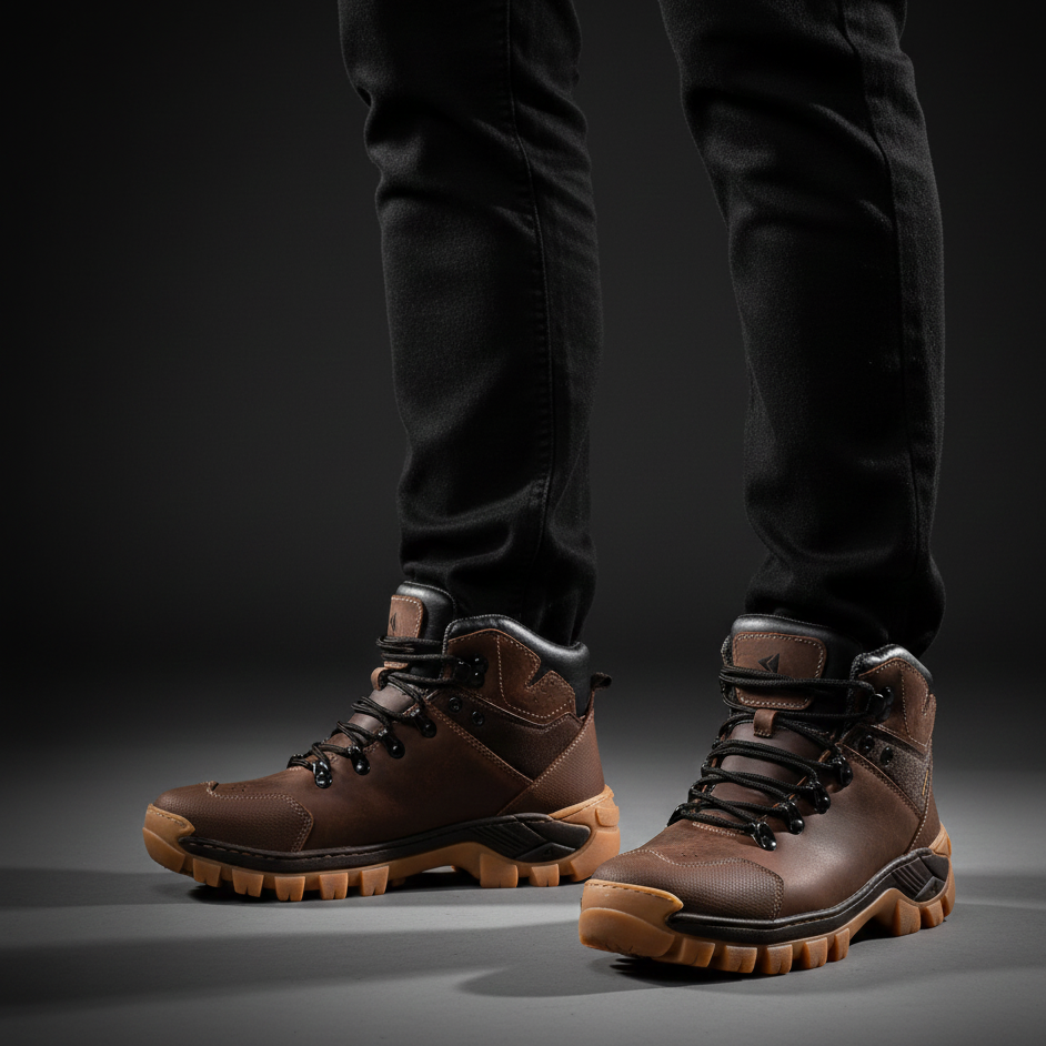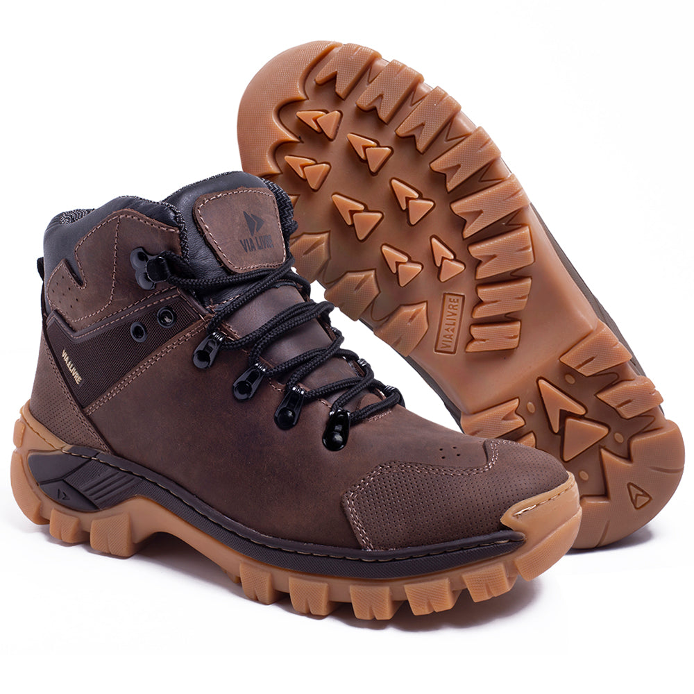 Solado em borracha natural, costurado e colado, com tração superior e resistência à abrasão.