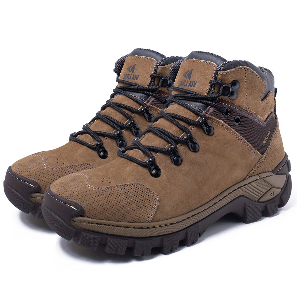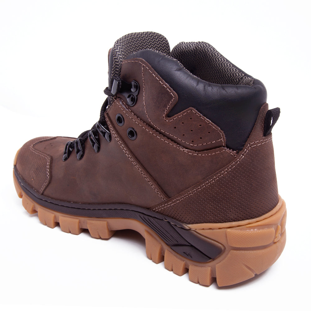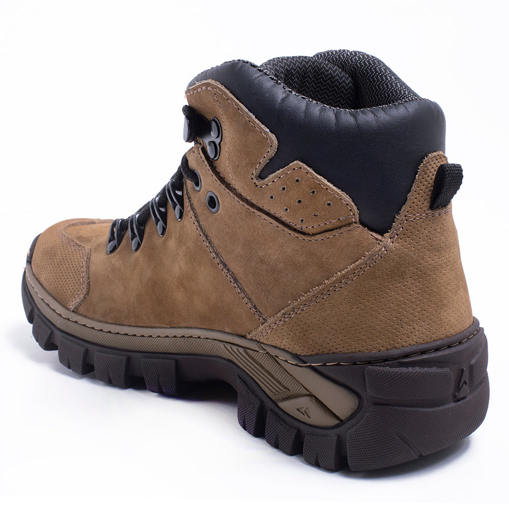 Solado em borracha natural, costurado e colado, com tração superior e resistência à abrasão.