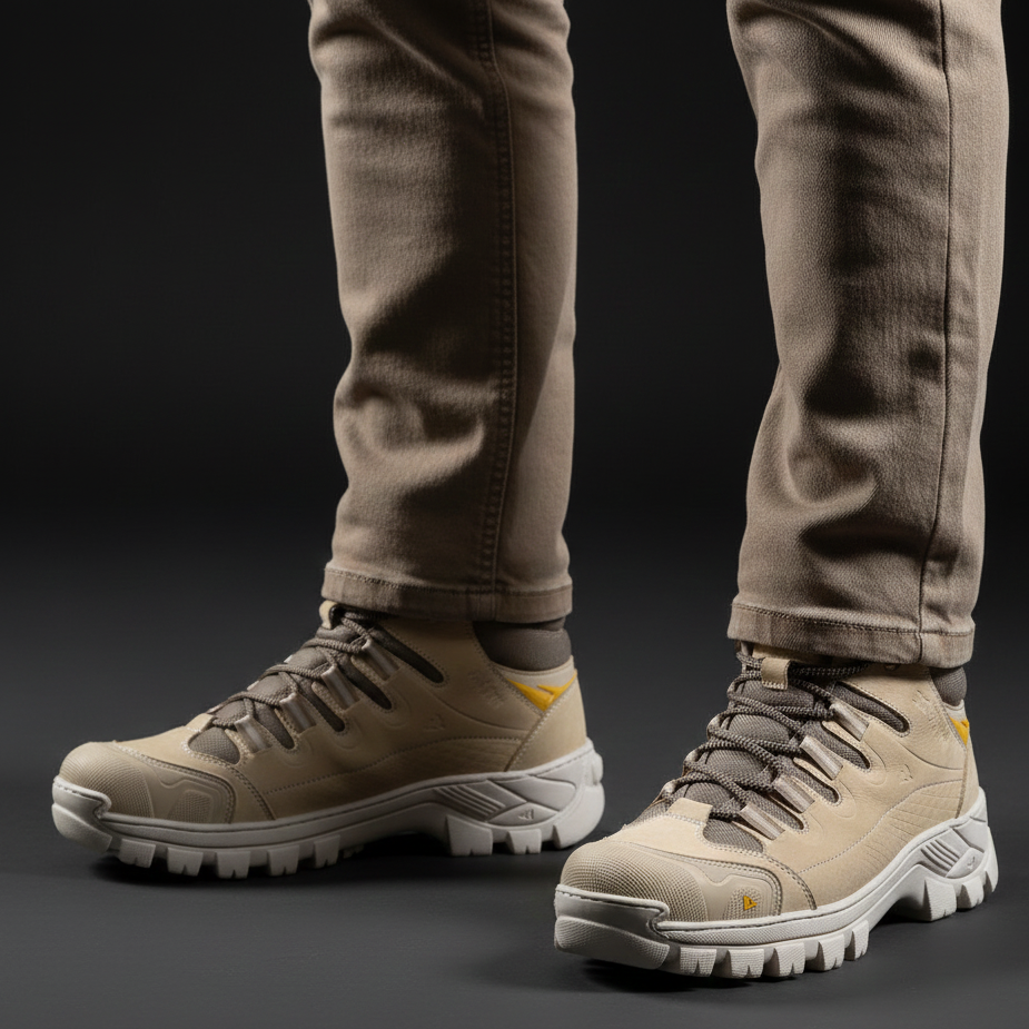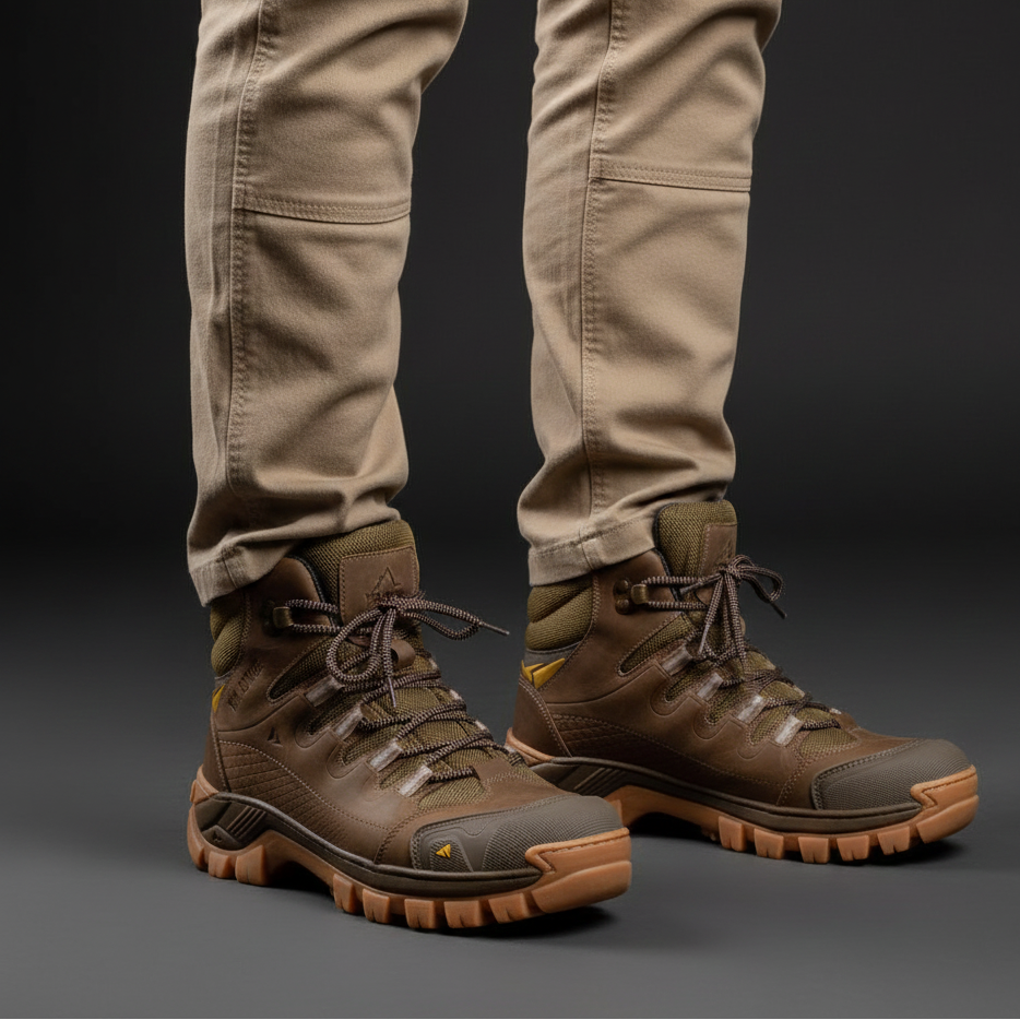 Solado em borracha natural, costurado e colado, com tração superior e resistência à abrasão.